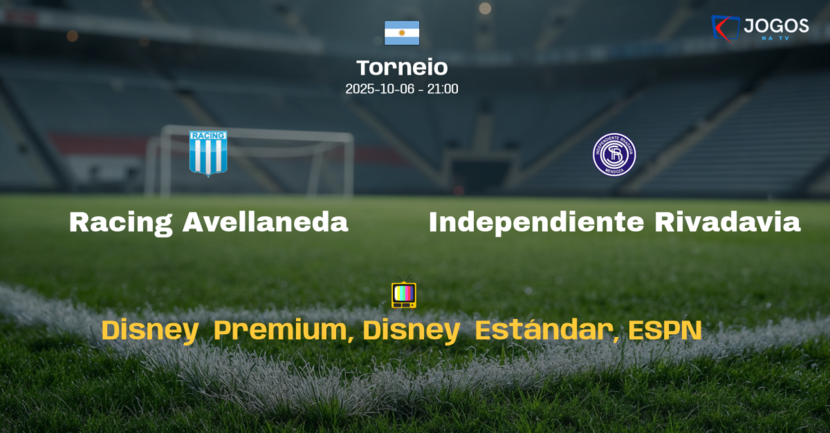O jogo entre Racing Avellaneda e Independiente Rivadavia terá transmissão ao vivo pelos canais ESPN e pelos serviços Disney+ Premium e Estándar.